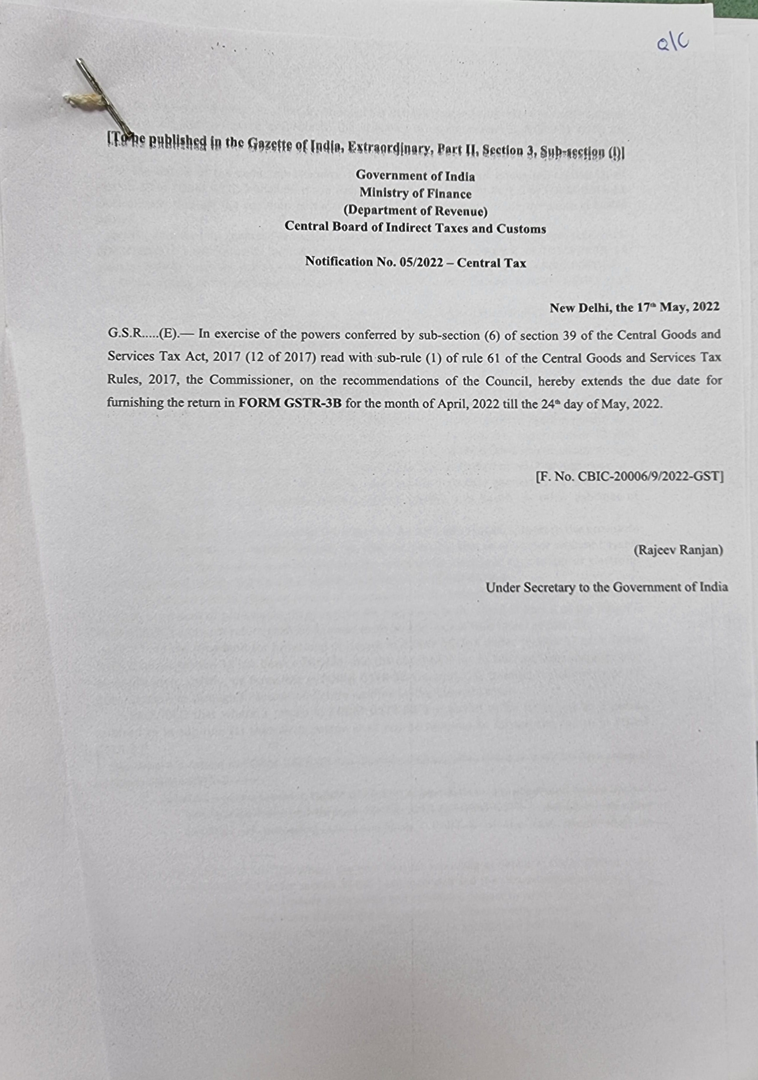 Extension of due date for furnishing the return in FORM GSTR-3B, Notification No. 05/2022 - Central Tax |